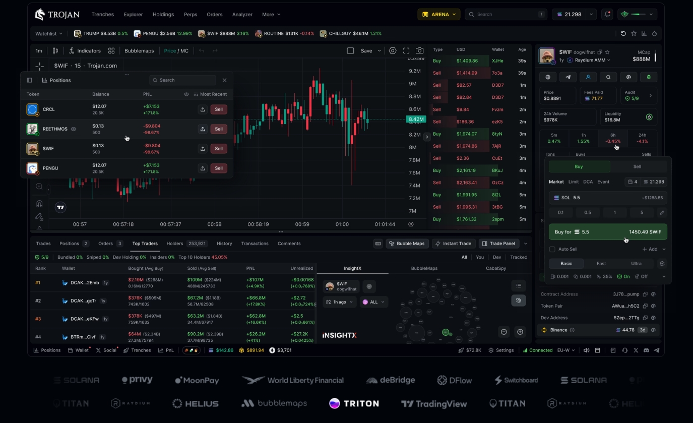 In simplest terms Terminal is a non-custodial trading and data platform; think CEX + DEX + screener. In practical terms however, it is much more than just a mashup of previously existing systems. Trojan Terminal is a unified base of operations, a place where users retain custody of their funds, data is live and accurate, execution is nearly instant and accurately priced, charting is simple and powerful, and where every market, no matter how new, is accessible.